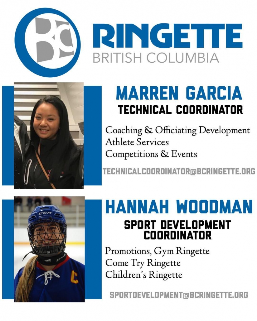 Ringette BC would like to express our gratitude and appreciation to Marren Garcia and Hannah Woodman for all of the work they did over the past season as members of the Ringette BC team. Marren and Hannah joined Ringette BC last February as the Technical Coordinator and Sport Development Coordinator as part of a parental leave coverage. Both Marren and Hannah worked very hard over the year to help advance the sport of ringette in BC. Thank you to you both for all your work! Hopefully we will see you at the rink.